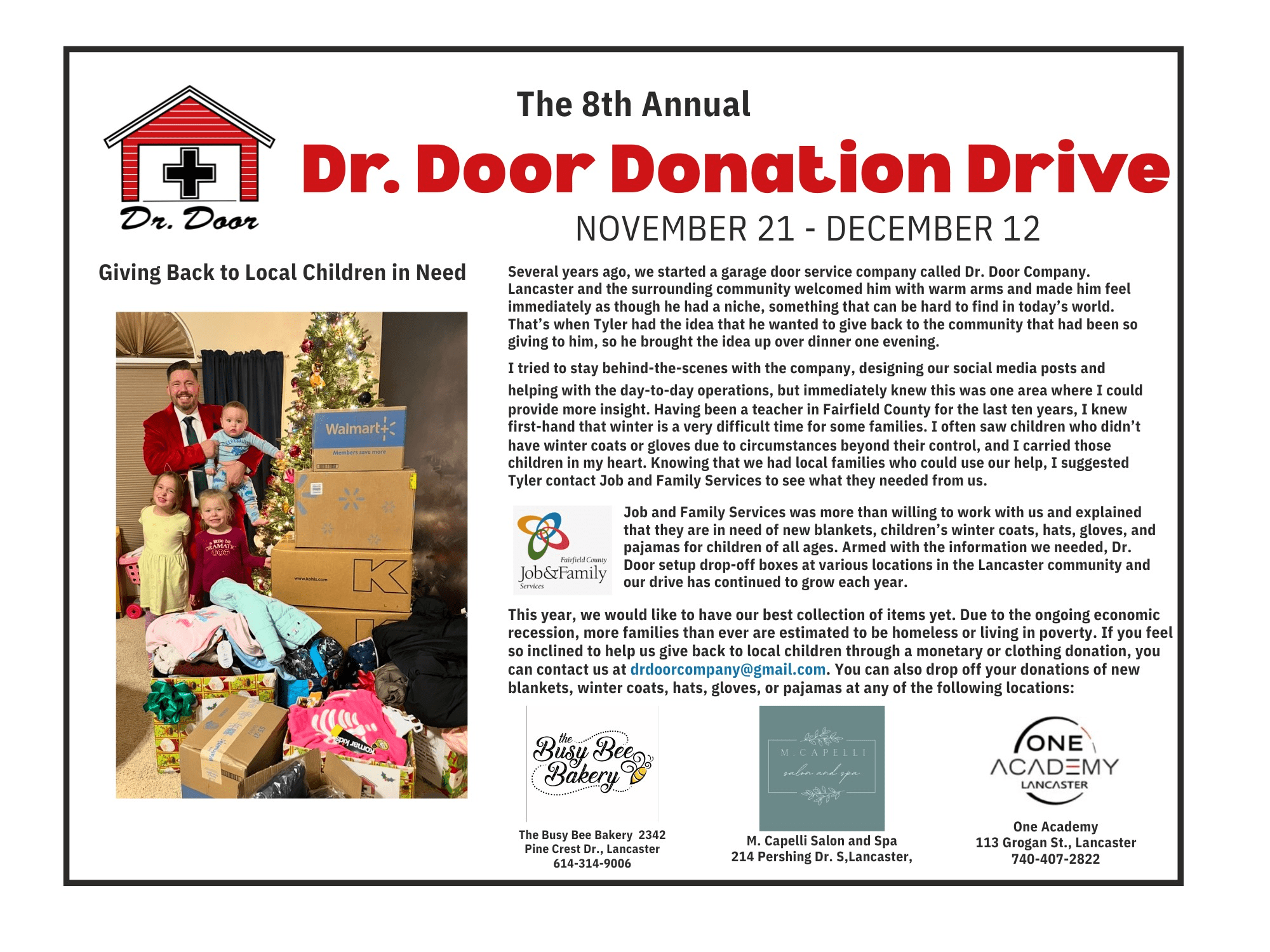 Our annual Door Donation Drive is taking place November 21 – December 12 this year! We use this opportunity to give back to children in need. Tyler Cassidy founded Dr. Door Company in Lancaster, OH, and he instantly felt welcomed in the community. So, he decided to give back!